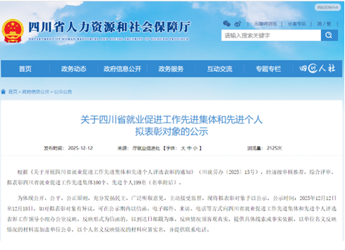 (附 四川省就业促进工作先进集体名单:http://rst.sc.gov.cn/rst/gsgg/2025/12/12/51adb3a2cd5e4e8dba5a78fb1c5ef23b.shtml)